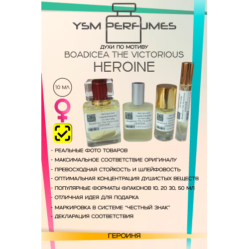 Boadicea the Victorious — Heroine («Героиня») — это один из самых популярных и обсуждаемых ароматов британского нишевого бренда. Его часто называют запахом уверенной в себе женщины, «статусным» и бескомпромиссным.