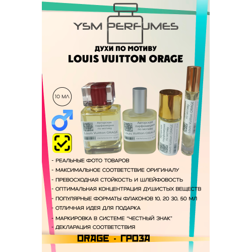 Louis Vuitton Orage (в переводе с французского — «Гроза») — это мужской аромат, выпущенный в 2018 году.Он входит в коллекцию Les Parfums Louis Vuitton и был создан штатным парфюмером дома Жаком Кавалье-Белльтрюдом (Jacques Cavallier-Belletrud).