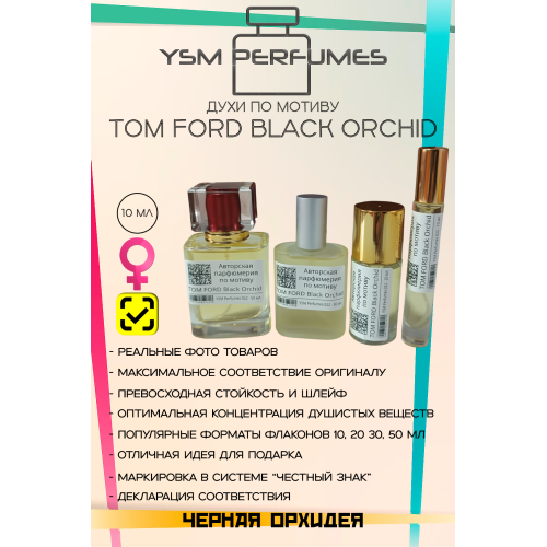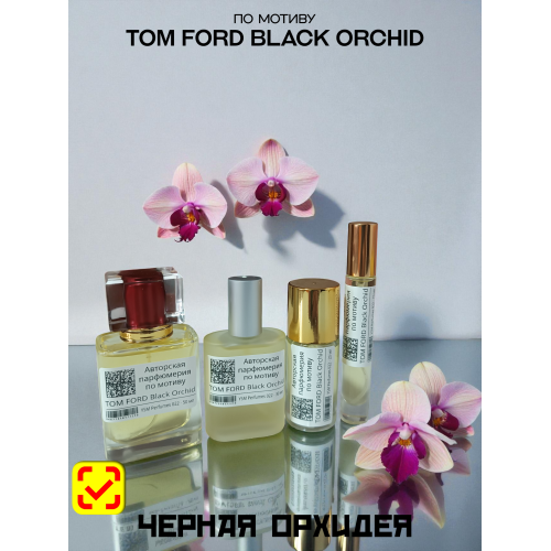 Верхние ноты: Самая узнаваемая и спорная часть аромата. Здесь доминирует черный трюфель (грибная, землистая нота) в сочетании с иланг-илангом, черной смородиной и цитрусами (бергамот, мандарин). Это сочетание создает эффект «влажной земли» и сладких цветов. Ноты сердца: В центре находится аккорд той самой «черной орхидеи» (фантазийная нота), дополненный цветочными тонами (лотос, гардения, жасмин) и специями. Базовые ноты: База густая, сладкая и шлейфовая. Основные игроки здесь — мексиканский шоколад, пачули, ладан, ваниль, сандал, амбра и ветивер. Шоколад и пачули придают аромату глубокий, почти гурманский, но не приторный оттенок.